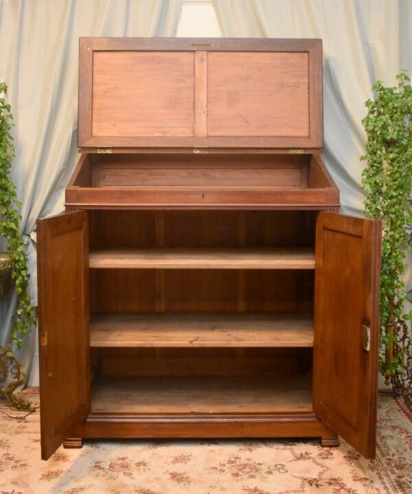Le plateau incliné est équipé d’une baguette permettant de maintenir l’ouvrage consulté. Il sert également d’écritoire. Ce plateau s’ouvre sur un espace de rangement . Les deux portes de la partie inférieure du meuble ouvrent quant à elles sur un second ensemble de rangement composé de deux épaisses et solides étagères.