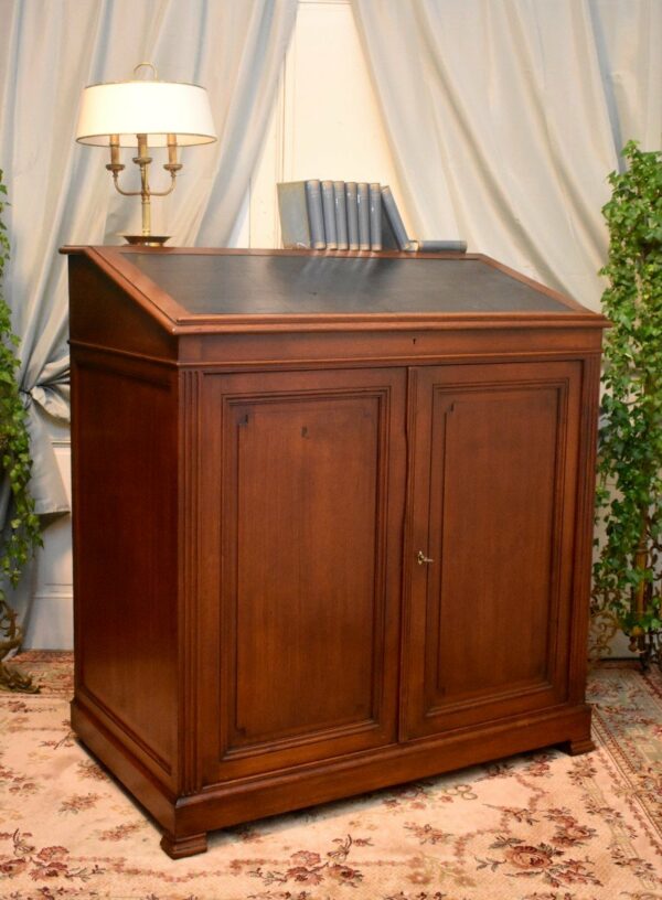 Ce pupitre est en bon état d’usage. Des usures sont bien evidemment présentes, essentiellement sur le cuir ( voir photos) . A noter également, un manque le long de l’abattant de la porte droite, ne gênant en rien la fermeture du meuble ( voir photo).